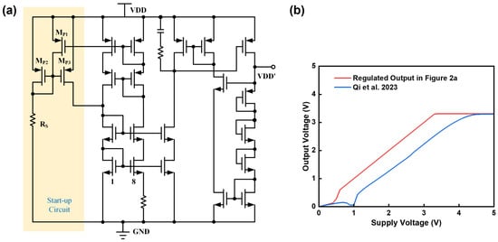 The pre-regulator circuit discussed in this article is illustrated in Figure 2a. Transistors , , along with the resistor collectively form the start-up circuit, ensuring stable and reliable operation of the pre-regulator module. A self-biased current source is implemented using a cascode current mirror, providing a current that remains independent of the supply voltage. This current flows through the diode-connected MOS transistors to generate the regulated output voltage. High-voltage devices are utilized in the pre-regulator circuit to efficiently convert a wide range of input voltages into a lower, more stable output voltage. Incorporating a feedback loop minimizes the impact of power supply fluctuations on the output voltage stability. In contrast to the pre-regulator circuit described in [11], this design utilizes a PMOS transistor for driving rather than an NMOS transistor. This choice allows for a reduction in the minimum operating voltage of the pre-regulator circuit. As illustrated in Figure 2b, the PMOS-driven circuit achieves a lower minimum operating voltage by one threshold voltage compared to its NMOS-driven counterpart. During operation, the regulator maintains a tiny drop-out voltage relative to the supply, ensuring normal operation even under low-power conditions and reducing energy loss from the power source.