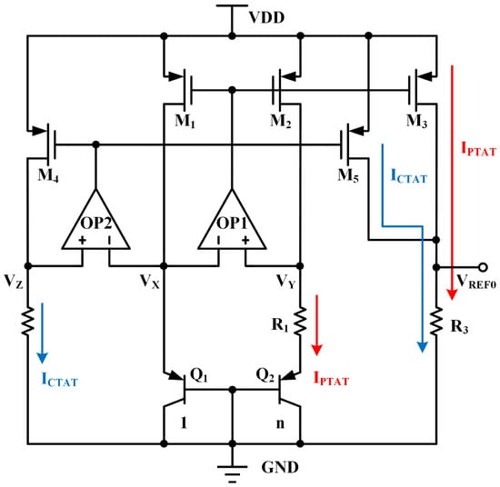 Figure 3 presents a current-mode BGR circuit [12], where the operational amplifiers OP1 and OP2 adjust the gate voltage of the PMOS devices to equalize , , and . Transistor consists of unit transistors connected in parallel, and is a single unit transistor. This configuration generates PTAT and CTAT currents, with their expressions given as follows.