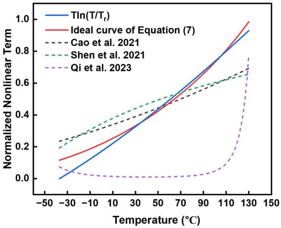 The resistor values of and can be determined through numerical simulations using specialized software (such as MATLAB R2023b). Nonlinear terms can be eliminated by applying compensating current. Figure 5 illustrates that compared with former research, the generated current effectively matches the term across a wide temperature range. The error between these curves remains below 10% across temperatures ranging from 10 °C to 130 °C.