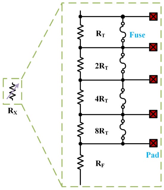 Figure 6 illustrates the resistance trimming network utilizing the fuse trimming technique employed in this work. The fixed resistance of and are 6.66 MΩ and 6.44 MΩ, respectively, and the unit trimming resistance connected in parallel with the fuse are 40 kΩ and 60 kΩ.