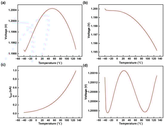 BGR output under temperature variation. (a) BGR output using structure in Figure 3. (b) BGR output without . (c) Compensation current . (d) BGR output after compensation.
