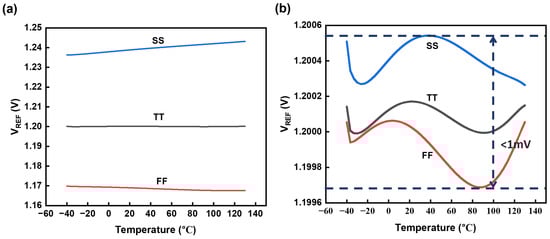The untrimmed output of the BGR under different process corners is illustrated in Figure 9a (T, S, F are abbreviations for typical, slow, and fast, representing carrier mobilities. The first letter refers to NFETs, while the last letter refers to PFETs.). The variation between corners and temperatures reaches 6.5%. Through fuse trimming, the vertical discrepancy in output voltage across various corners is maintained within a margin of 1 mV. Table 1 presents the TCs of the proposed BGR before and after trimming. The results indicate that the circuit is capable of delivering a stable reference voltage despite significant temperature variations.