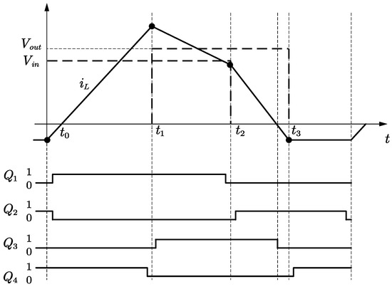 Considering the junction capacitance of the MOSFETs (Metal–Oxide–Semiconductor Field-Effect Transistors), the turn-off process of the four MOSFET switches in the FSBB can be approximated as a zero-voltage turn-off. For an FSBB converter employing the synchronous control of paired MOSFETs, the turn-off of Q1 and Q4 results in the discharge of the junction capacitance of Q2 and Q3. This is followed by the conduction of the body diodes of Q2 and Q3, which clamp the drain-source voltages of Q2 and Q3 to a zero-voltage state. This enables Q2 and Q3 to achieve zero-voltage turn-on. However, upon the deactivation of Q2 and Q3, the inductor current is unable to discharge the junction capacitance of Q1 and Q4, thereby preventing zero-voltage turn-on in these components. If the inductor current in Q2 and Q3 can reverse, a modest negative current will allow the discharge of the junction capacitance of Q1 and Q4, thereby facilitating zero-voltage turn-on. At this point, the synchronous control of the transistors can enable soft switching for all switches in the FSBB converter. Similarly, this method can facilitate soft switching in the FSBB converter when operating in both buck and boost modes. The principal operational waveforms are illustrated in Figure 3.