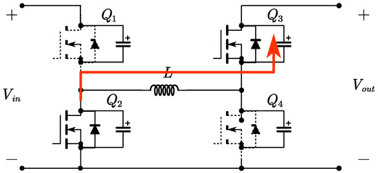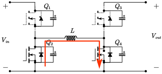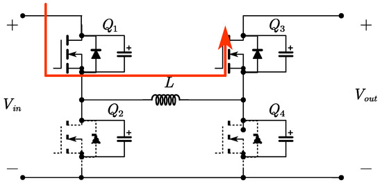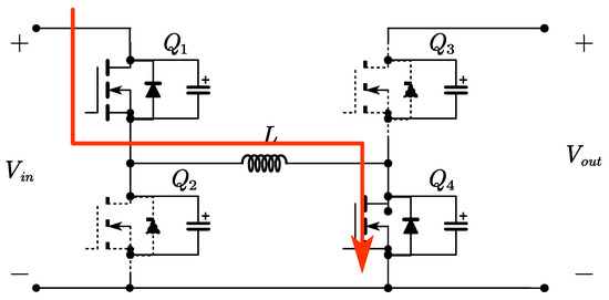 The FSBB circuit schematic is shown in Figure 1. When operating in buck mode, Q1 and Q2 conduct complementarily to each other, defining the duty cycle of Q1 as D1. When operating in boost mode, Q3 and Q4 conduct complementarily to each other, defining the duty cycle of Q4 as D2. The relationship between input voltage Vin and output voltage Vout can be obtained from the inductor volt–second balance relationship: