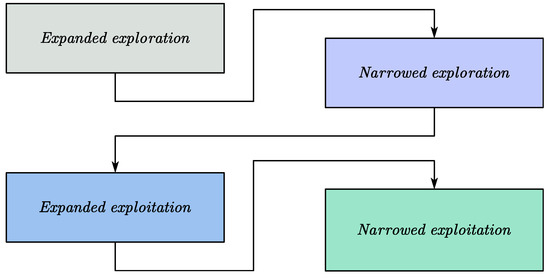 - Narrowed exploration: As the algorithm progresses, the search focuses on promising regions near the best solutions found so far. This phase refines the search to improve the accuracy of the solutions. The position is updated using the following equation:where PR is the random position, D is the dimension size, and LF represents Levy flight functions.