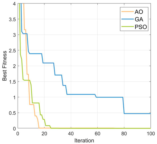 The experimental results show that the AO’s iterative structure allows for adaptive tuning, which is particularly beneficial in systems with significant dynamic behavior, such as FSBB converters. The PID controller’s performance is highly sensitive to parameter variations in nonlinear systems, and small changes can lead to vastly different system behaviors. The AO algorithm dynamically adjusts its search strategies based on the evolving fitness landscape, which enables it to fine-tune the PID parameters more precisely to minimize overshoot and settling time. This adaptability is crucial in managing the fast transients and nonlinearities of FSBB converters, where fixed or static optimization approaches, like GA, may struggle to adapt to changing system conditions or complex error surfaces.
