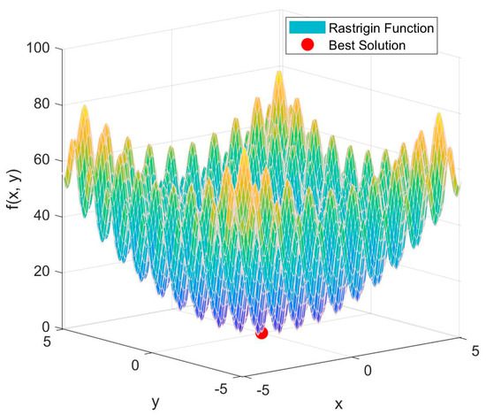 To verify the superiority of the AO optimization algorithm, the Rastrigin function was optimized using the AO, PSO, and GA algorithms, respectively. Figure 12 shows the convergence curves of the three optimization algorithms, demonstrating how the algorithms gradually find better solutions as the number of iterations increases. The comparison highlights the superiority of the AO algorithm. Figure 13 presents a 3D plot of the Rastrigin function, where the red dots indicate the optimal solutions found by the AO optimization algorithm.