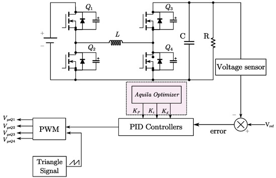 The following sections of this paper are structured as follows: Section 2 analyzes the operation and mathematical model of the FSBB converter. Section 3 details the optimization of the controller using the Aquila Optimizer. Section 4 presents the results of simulation and experimental studies of the closed-loop control. Finally, Section 5 provides a summary of this study’s findings.