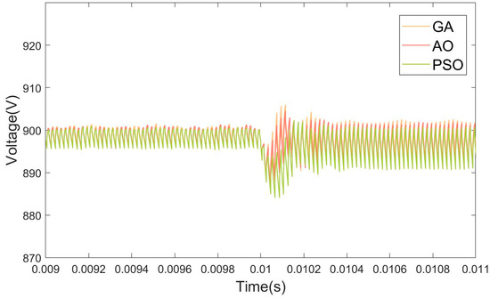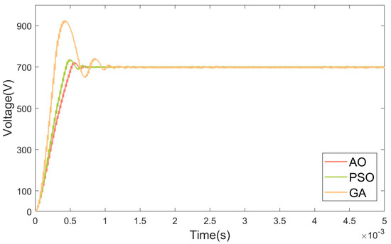 The objective of this section is to evaluate the basic performance of the AO-optimized PID controller under standard operating conditions, including a typical input voltage, nominal load, and no external disturbances. Two sets of experiments were designed to achieve voltage boosting and bucking, respectively, from 700 V to 900 V and from 900 V to 700 V. The results of these experiments are displayed in Figure 15 and Figure 16.