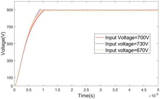 This section examines the controller’s performance when the input voltage fluctuates, a critical factor for FSBB converters, which are often used in applications where the input supply is unstable. The input voltages were set to 670 V, 700 V, and 730 V. The simulation results are shown in Figure 18.