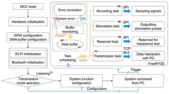 Once the Wi-Fi or Bluetooth setup is complete, the device listens for external connection requests. The host computer selects the desired transmission mode, sends a connection request, and the device responds by suspending the unused mode and releasing its resources. Given the system’s real-time and complex operation, a lightweight real-time operating system (FreeRTOS) is used. The workflow is divided into four core tasks: recording, stimulation, reserved, and transmission tasks, each handling specific system functions. A wireless event group and multiple message queues are created to enable inter-task communication and data exchange. The operating system handles resource scheduling and logic management to ensure an efficient workflow.