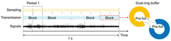 Regarding data storage, traditional CPU-based methods can increase system overhead. To improve communication efficiency and system stability, we implemented a dual-ring buffer mechanism (Figure 2), which allows for the data to be directly transferred from the SPI controller to the MCU’s internal random access memory (RAM), reducing the CPU’s load. The specific process is as follows: two equal-sized DMA buffers are pre-allocated in the RAM. Once one of the buffers reaches the set threshold, a signal is triggered to activate the transmission task. The MCU then initiates the internal radio module and transmits the collected data in blocks to the host computer in real-time using the pre-selected communication method (Wi-Fi or Bluetooth).