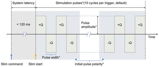 The device currently supports two modes of biphasic current pulse stimulation, distinguished by the initial pulse polarity: anodic leading or cathodic leading. Figure 3 illustrates the schematic of the stimulation patterns, where “*” indicates the adjustable parameters. After configuring the stimulation parameters (e.g., pulse width, pulse amplitude) via the host computer, a stimulation sequence is initiated. The delay from the signal trigger to the actual stimulation current generation is approximately 120 ms, with each stimulation comprising 10 consecutive pulses.