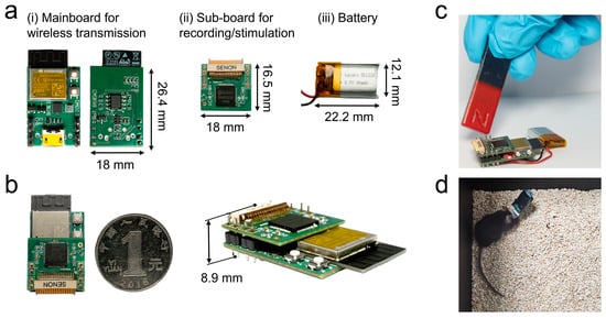 Wireless dual-mode BCI system architecture: (a) hardware components, including mainboard, sub-board, and battery; (b) stacked connection between mainboard and sub-board; (c) magnetic sensing switch for system’s wireless power control; (d) mouse equipped with wireless BCI.