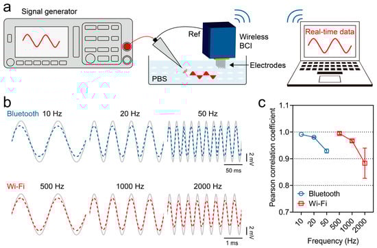 For the recording function, since neural signals span multiple frequency bands, a signal generator was used to output sine waves of various frequencies (10–2000 Hz) to test the device’s acquisition capabilities. The testing setup consisted of a wireless BCI device, a microelectrode array (KD-MWA-32, KedouBC, Suzhou, China), a signal generator, a phosphate-buffered saline (PBS) solution, and a PC. Both the electrodes and the signal generator output probe were immersed in the PBS solution, with their reference (ref) terminals connected to a common ground. The signals were then transmitted wirelessly (via Wi-Fi or Bluetooth) to the PC for recording. To evaluate the accuracy, the recorded signals were compared with standard signals at the same sampling rate using a Pearson correlation analysis. The Pearson correlation coefficient was calculated, where a value closer to 1 indicated higher signal similarity and minimal transmission distortion.