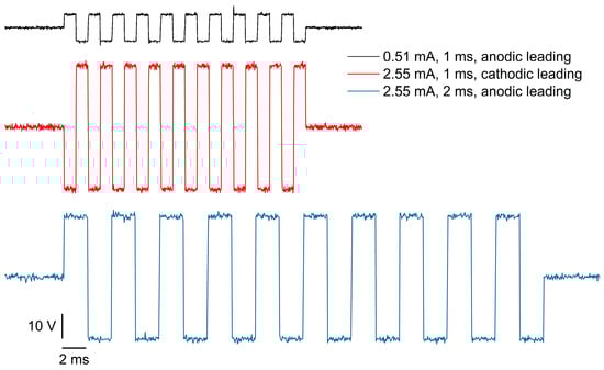 Voltage signals across 1 kΩ resistor under stimulating current pulses with varying parameters: pulse amplitude (0.51 mA, 2.55 mA), pulse width (1 ms, 2 ms), and initial pulse polarity (anodic leading or cathodic leading).