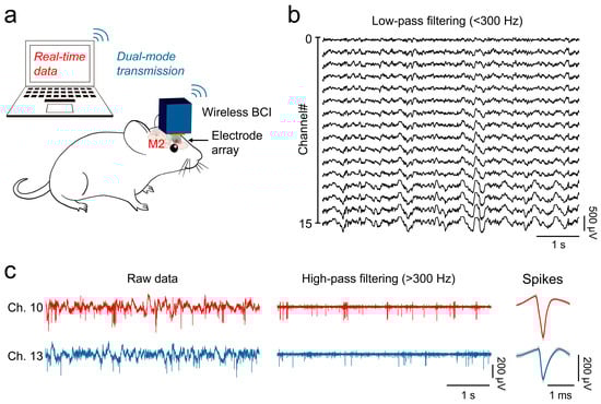All the animal experiments were approved by the Ethics Committee for Animal Management of the Shanghai Laboratory Animal Research Center (approval number: PA202300702). Eight-week-old male C57BL/6J mice were used in this study, with a microelectrode array (KD-MWA-32, KedouBC, Suzhou, China) implanted into their secondary motor cortex (M2: anteroposterior (AP) + 1.5 mm, mediolateral (ML) ± 0.75 mm, dorsoventral (DV) −1 mm). This brain region is associated with mouse motor functions, featuring highly active neurons, making it suitable for observing neural signal changes [,]. Neural signal recording was conducted on the 8th day post-implantation. During the experiment, all-channel signals were recorded using the Bluetooth mode to capture the multi-channel local field potentials. Additionally, two channels were selected for high-sampling-rate recording via Wi-Fi to obtain single-neuron spike firings.
