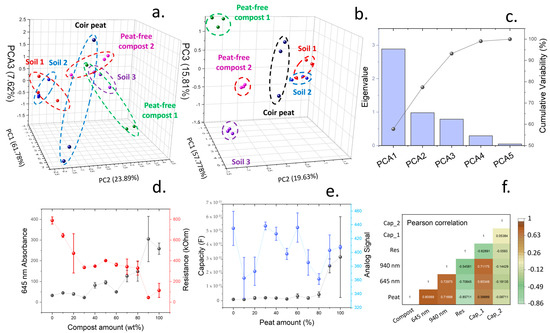 (a). Principal component analysis of results obtained after determination of intensity emissions from 18 wavelengths comprised between the visible to near-infrared range. (b). Principal component analysis of measurements obtained from the spectral intensities combined with impedance spectroscopy results. (c). Contributions to variance of different principal components in shown in (b). (d). Changes in both resistance, calculated from the impedance plots, and the absorbance at 645 nm in multiple coir peat/compost mixed soils. (e). Measured capacitance and moisture (labelled as analogue signal) at different coir peat/compost compositions. (f). Pearson correlation for each physical parameter studied in this work and soil compositions.