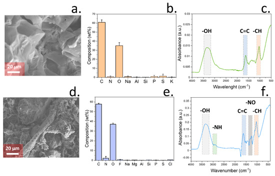 Contrary to the morphology observed in the case of coir peat, the compost sample showed a heterogeneous structure, containing plant-derived material and small soil particles (Figure 3d). However, in this case, a higher amount of nitrogen was recorded by EDS, with 2.2 wt% (Figure 3e), along with traces of silicon (0.39 wt%) and electrolytes including Na (0.19 wt%), Mg (0.28 wt%), and Cl (0.46 wt%). When peat-free compost was analysed by FTIR, the obtained spectra presented similarities with the one obtained by coir peat, with peaks at 3300 cm−1, 1630 cm−1, and 1100 cm−1 due to the presence of lignocellulose materials. However, in this case, additional stretches were observed at 2920 cm−1 and 1550 cm−1, which were attributed to the N-H stretching vibrations and nitrate ions, respectively [54,55]. These results are consistent with the previously observed composition of the compost sample given by EDS, with a higher concentration of nitrogen elements compared to coir peat.