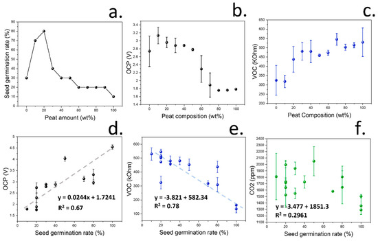 To study the applicability of the soil-testing device in the determination of fertility, seven different gas sensors were incorporated, which could be used to determine eight gas-related parameters: air humidity, tVOC, CO2, reducing gases including H2, methane, alcohol, carbon monoxide, and O3/NOx. In the case of tVOC, the electrical resistance of the gas sensor was used for the calculations since it is inversely proportional to the concentration of gas volatiles. The volatile release and OCP changes from the coir peat/compost mixtures developed in the previous section for soil classification were tested, and the seed germination rate was determined. An optimal seed germination rate was measured when a composition of 20 wt% coir peat and 80 wt% of peat-free compost was used, with a germination rate of 80 wt% (Figure 4a). In addition, the higher amount of peat was reflected in a lower detection of OCP and decrease in VOCs (Figure 4b,c), which was expected given the lack of macronutrients and bacteria population in coir peat. A complete Pearson correlation matrix for this experiment, including correlations from all variables, is shown in Figure A6.