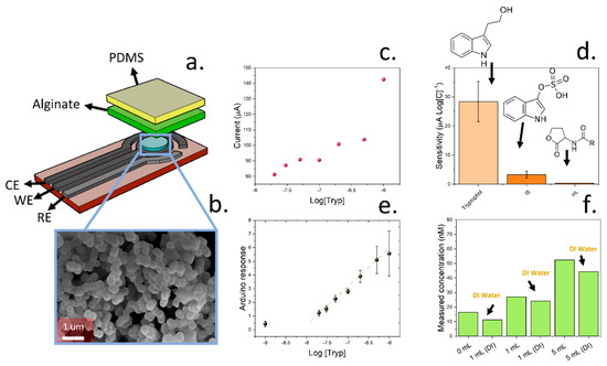 A screen-printed sensing device was designed for the direct quantification of tryptophol in soil samples. The sensor incorporated a three-electrode cell with molecularly imprinted silica fine particles. Alginate hydrogel and PDMS were then deposited as the binding matrix (Figure 5a). Functionalised silica-based particles were synthetised using cyclodextrin and 3[(trimethoxysilylpropyl] diethylenetriamine as the specific functional groups to promote the adsorption of tryptophol (Figure 5b). The combination of cyclodextrin and amine groups allowed a specific adsorption of tryptophol, driven by the strong interactions between cyclodextrin and indole groups [76] as well as the formation of hydrogen bonds with 3[(trimethoxysilylpropyl] diethylenetriamine (Figure A7). The chemical composition of the silica fine particles was confirmed by FTIR after synthesis (Figure A8). Peaks located at 3200, 2900, 1456, and 1026 cm−1 were measured, corresponding to the -OH, CH, -CN, and Si-O stretches, respectively [39,77]. The final material was deposited onto screen-printed electrodes by drop casting (Figure 5b), and an alginate layer was fabricated by an aerosol method, as previously reported in our previous work, which showed a good batch reproducibility [39]. In addition, a PDMS film was deposited to prevent the evaporation of water from the hydrogel film. The combination of both alginate hydrogels and protective PDMS film allowed the operation under dry environments and led to a low device thickness of 15.8 µm, as measured by a stylus profilometer. This approach was implemented in the development of mechanically resilient hydrogel-based sensors, which can avoid dehydration by incorporating an elastomer top layer [78,79,80].