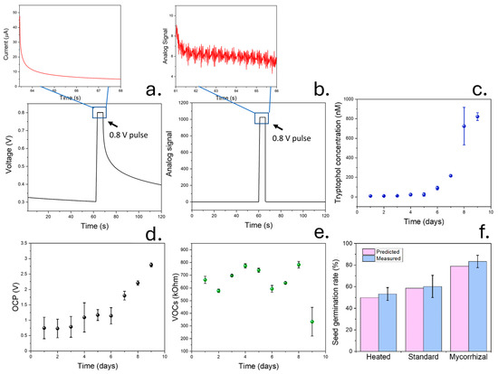After the validation of sensing performance of molecularly imprinted silica nanoparticles in soil, devices were tested for 9 days inside a testing chamber. Pulse voltametric signals were recorded and analysed (Figure 6a,b). This experiment allowed the determination of dynamic changes in soil volatiles and biological activity due to the incorporation of mycorrhizal fungi. A 1:4 mixture of coir peat/compost was used in this case since it provided the highest seed germination rate among the tested compositions. Similar to the previous case, the soil samples were initially sterilised by washing using DI water and heating to 200 °C. The produced volatiles as well as OCP measurements and tryptophol concentrations were determined for 9 days, allowing a study of changes in soil microbial activity after subjecting the samples to different conditions. These parameters were initially measured for 2 days in pristine soil after sterilisation, and the samples were then watered. Measured concentrations of tryptophol during these 4 days remained approximately constant, within 10 nM (Figure 6c). This value was similar to the one measured in the previous case using a sterilised pristine soil sample (16 nM). Only after the direct incorporation of mycorrhizal fungi on day 5 was the concentration of tryptophol increased, reaching 822 nM on day 9. A similar concentration was then measured on day 9. Similar results were observed in ectomycorrhizal fungi samples by [83], reporting a concentration of tryptophol in the micromolar range after 10 days of culturing.