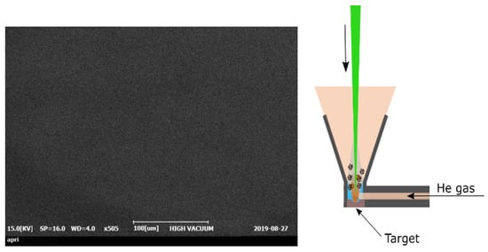 The laser treatment was conducted using the high-vacuum chamber shown schematically in a previous paper []. To obtain accurate and reliable results, variables such as laser power and gas pressure were meticulously controlled. A dry pump and a turbo-pump were used to achieve a high vacuum of . Helium (He) gas was introduced into the side of a de Laval-type conical supersonic nozzle through a 2 mm diameter pipe at various backing pressures of 0.5, 1.0, and 1.5 bar. The flow of He was regulated via a pulsed solenoid valve (Parker Series 9) with an opening time of 6 ms. A time delay of +3 ms existed between the laser and the gas operations. During the introduction of He, the chamber pressure increased to . In total, 300 consecutive laser shots were applied to the target by using a Nd:YAG laser ( nm, ns, repetition rate = 5 Hz). The laser beam was focused into a Cu target with a beam size of 1 mm, and the Cu target was ablated by using various laser pulse energies of 30, 60, and 90 mJ/pulse, giving laser fluence of 3.8, 7.6, and 11.5 J cm−2 []. The minimum laser fluence required to initiate the ablation of Cu, termed the ablation threshold fluence (), was determined to be ~3.3 J cm−2 in accordance with the following equation [,]: