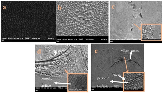 The SEM images of the Cu surface before and after the various laser treatments are presented in Figure 2, Figure 3 and Figure 4. Thus, after irradiation under air at 30 mJ/pulse (Figure 2a), the Cu surface is uniformly covered by micro-cones, which can be compared with the smooth surface of the pristine Cu (Figure 1). When irradiated under vacuum, however, the Cu surface is covered by cavities and droplets in the submicrometer size range (Figure 2b). After irradiation under a gas pressure flow of 0.5 bar through the supersonic nozzle, the surface exhibits a combination of cone-shaped structures and splash patterns, along with small dips and droplets in the nanometer size range (Figure 2c and the inset). Upon increasing the gas pressure to 1.0 and 1.5 bar (Figure 2d,e), periodic surface structures in the form of cone-shaped ripples are formed on the 10 μm scale (insets). These ripples are accompanied by nanometer-sized droplets located around the periphery of the irradiated area. At the center of the irradiated surface, island-like structures, micro-pillars, and cavities are observed. These results demonstrate that the nanosecond laser treatment can be used to generate similar grating-like grooves to those obtained using a femtosecond laser.