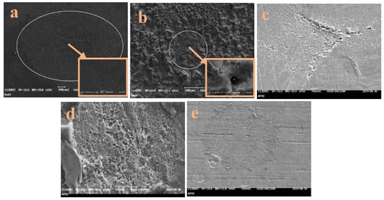 The SEM images of the Cu target after irradiation at 90 mJ/pulse under (a) air, (b) vacuum, and (c–e) gas flow through the supersonic nozzle a pressures of (c) 0.5 bar, (d) 1 bar, and (e) 1.5 bar.