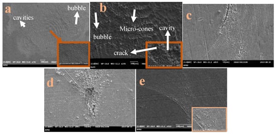 After irradiation at 60 mJ/pulse under air, the Cu surface in Figure 3a exhibits a uniform morphology over the entire irradiated area. Within the laser spot area, a pseudo-periodic surface structure is observed. At the periphery, however, the surface is covered by cracks, cavities and micro-pillars. Under high vacuum, the irradiated surface entirely covered with grooves, micro-pillars and cavities with an average diameter of 2.5 μm (Figure 3b). After irradiation under a gas pressure flow of 0.5 bar through the supersonic nozzle, however, the Cu surface exhibits a similar cone-shaped pattern to that observed in Figure 2e, with perforations on the periphery (Figure 3c). In addition, micro-pillars are observed at the center of the irradiated surface. Increasing the gas pressure to 1 bar results in the removal of peels from the molten layer and the emergence of dip structures on the irradiated surface, thus leading to a rough surface with numerous pores (Figure 3d). Further increasing the gas pressure to 1.5 bar results in the removal of a significant portion of the molten layer, along with the formation of dips, as well as bubbles that cover the entire irradiated surface (Figure 3e).