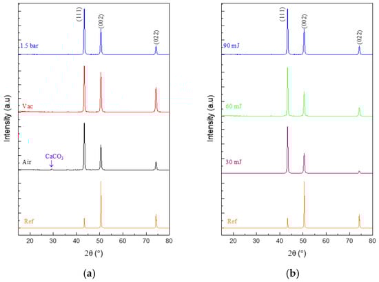 The XRD patterns of the pristine and variously irradiated Cu samples are compared in Figure 5. Here, the pristine Cu exhibits peaks at 2θ = 43.405°, and 43.410°, which can be matched to the (111) crystal plane of the face-centered cubic (fcc) phase, along with peaks at 2θ = 50.554° and 50.560° due to the (002) crystal plane (ICDD card 98-065-5129). Meanwhile, the phase changes occurring in the variously irradiated samples are revealed by shifts in the peak positions and intensities. Specifically, the (111) peak increases significantly in intensity, while the (002) peak decreases, after laser irradiation at 90 mJ/pulse under air, vacuum, or at 1.5 bar (Figure 5a), and similar results are observed after irradiation under high-pressure 1.5 bar gas flow at 30, 60, or 90 mJ/pulse (Figure 5b). In addition, after irradiation under air, a new peak is observed at 2θ = 30° in Figure 5a, which can be attributed to the presence of calcite (CaCO3).