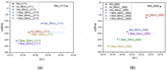 where is the residual stress, E is Young’s modulus (110 Gpa for Cu), is Poisson’s ratio (0.35 for Cu) [], is the theoretical diffraction angle, and is the experimental diffraction angle. The variations in the calculated residual stresses in the (111) and (002) planes as a function of diffraction angle before and after the various laser treatments are plotted in Figure 6 and summarized in Table 3. Here, the sign of the stress value is positive for the pristine copper, but negative after the various laser treatments. This indicates a shift in the residual stress from tensile before laser treatment to compressive afterwards.