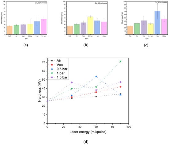(a–c) Bar charts comparing the hardness values of the copper surface before and after irradiation under various environments at laser energies of (a) 30 mJ/pulse, (b) 60 mJ/pulse, and (c) 90 mJ/pulse; (d) plots of hardness against laser energy under each environment.
