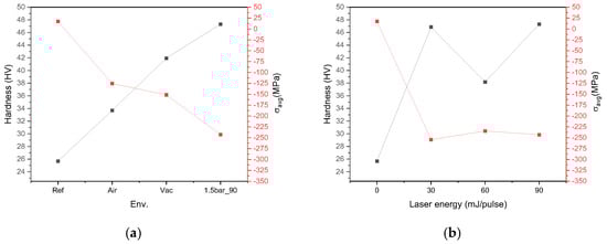 (a) Relationship between average residual stress (σave; red axis) and laser environment, and that between hardness value (black axis) and laser environment, at a fixed energy of 90 mJ/pulse; (b) the relationship between average residual stress (red axis) and laser energy, and that between hardness value (black axis) and laser energy, under a fixed environment of 1.5 bar.