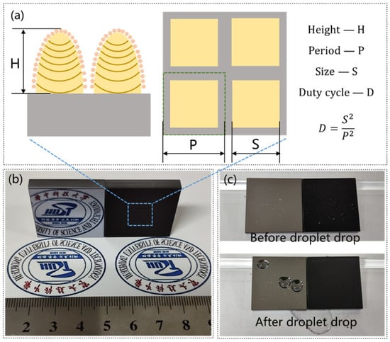 (a) Detailed explanation of microstructure parameters, (b) the anti-reflective effect of samples (The pattern is the emblem of Huazhong University of Science and Technology), and (c) the self-cleaning effect of samples before and after the droplet drop.