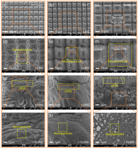 SEM images of micro/nanostructured surfaces. (a–c) Micro/nanostructures with different structural heights (H), duty cycles (D), and sizes (S). (d–f) Microstructures; (g–i) LIPSS; (j–l) nanoparticles.