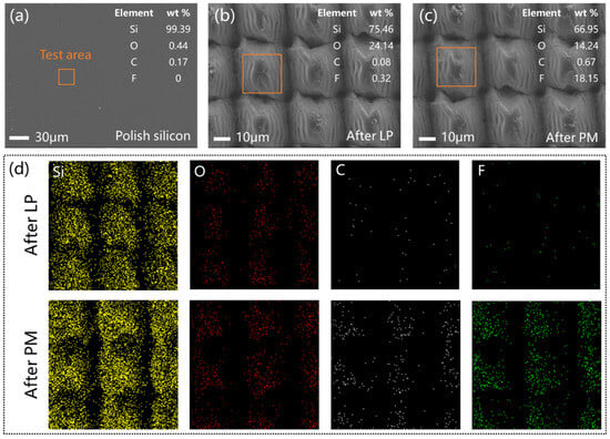 The elemental content of micro/nanostructured surfaces was analyzed qualitatively by EDS after laser processing (LP) and perfluorosilane modification (PM). After LP, the mass fraction of the surface oxygen element increased from 0.44% to 24.14% (Figure 3a,b). This indicates that laser processing caused oxidation reactions on the silicon surface. The mass fraction of fluorine element after LP was only 0.32%, but it increased to 18.15% after PM (Figure 3c). Due to the special structure and chemical properties of fluorosilane molecules, an extremely thin layer of fluorosilane molecular film was formed on the surface during the modification process, and the micro/nanostructure did not change. As shown in Figure 3d, the EDS surface scan obtained the element distribution information of the test area, and the fluorine element was uniformly distributed on the microstructure’s surface.