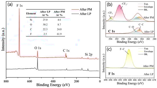 The XPS survey spectra of micro/nanostructured surfaces after LP and after PM. (a) XPS full spectrum. (b,c) High-resolution XPS spectra for C 1s and F 1s.