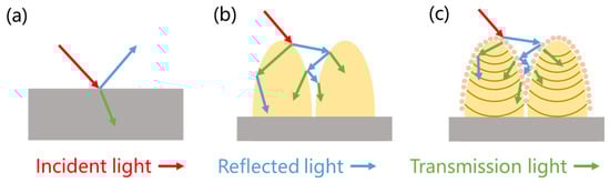 Figure 5 shows a schematic of the anti-reflective principle of light waves propagating through different characteristic structural surfaces. When the incident surface is almost flat, a portion of the light is absorbed by the substrate material and another portion of the light is reflected out of the surface, which is related to the inherent characteristics of substrate material, as shown in Figure 5a. The schematic diagram of the propagation of light waves incident on the surface of microstructures (Figure 5b) indicates that when the size of the spacing between microstructures is much larger than the wavelength of the incident light, microstructures exhibit excellent light capture performance. Electromagnetic waves are captured and reflected multiple times in the microstructure, and an increase in optical path length leads to an increase in energy absorption. In addition, the presence of submicron and nanostructures with structural dimensions similar to or smaller than the wavelength further reduces the reflection phenomenon caused by the sharp change in refractive index, thereby reducing surface light reflection (Figure 5c). Therefore, the surface with micro/nanostructures is conducive to enhancing its surface anti-reflective properties.