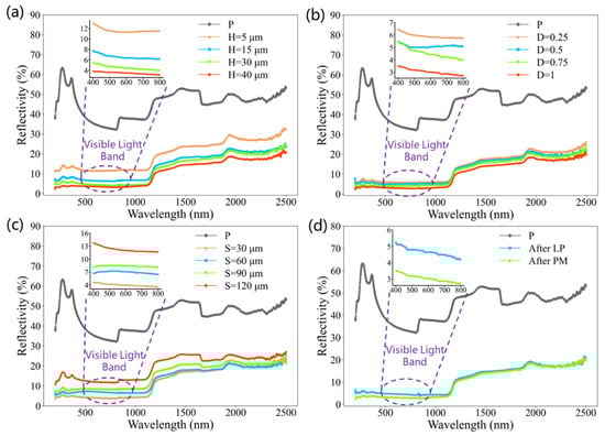Reflectance spectra of micro/nanostructured surfaces at 200–2500 nm. (a) Different heights, (b) different duty cycles, and (c) different sizes. (d) After LP and after PM.