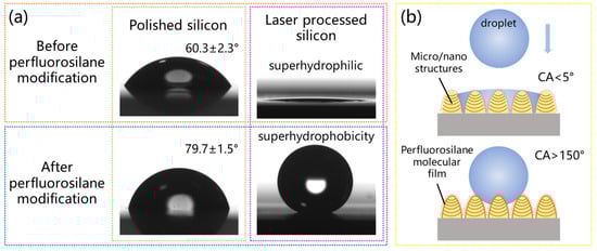 To evaluate the wettability of the multi-scale micro/nanostructured silicon surface, water contact angle (WCA) measurements were carried out. The water contact angle measurement of 60.3 ± 2.3° for the polished silicon surface is shown in Figure 7a. After laser processing, a large number of oxides are formed on the surface of silicon, and liquid droplets infiltrate into the microstructure according to the Wenzel formula [], resulting in the surface of the micro/nanostructures exhibiting superhydrophilicity. To obtain hydrophobicity of the prepared surface, the typical fluoroalkyl silane modification is adopted here. After perfluorosilane modification, the surface treated with the laser changed from superhydrophilic to superhydrophobic. Rough structures can increase contact angles due to the decrease in the solid–liquid contact area according to the Cassie–Baxter formula [], causing a superhydrophobic surface. Figure 7b shows a schematic diagram of the wettability transition. After the sample is immersed in the fluoroalkyl silane solution, hydrolysis and condensation reactions will occur, and the sample surface will self-assemble to form a single or multi-molecular film []. The outside of this film is covered by –CF3 and –CF2– groups, which have good hydrophobic properties []. In addition, the contact angle of the polished silicon surface after perfluorosilane modification only increased to 79.7 ± 1.5°, but the micro/nanostructured surface exhibits a large contact angle (CA) of 172.3 ± 0.8° and a low sliding angle (SA) of 4.2 ± 1.4° for water. This proves that both micro/nanostructures and low surface energy are indispensable conditions for the preparation of superhydrophobic surfaces.