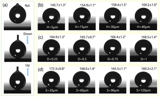 (a) The contact angle testing process of a 4 μL droplet. (b–d) The contact angle of micro/nanostructured surfaces with different heights, duty cycles, and sizes.