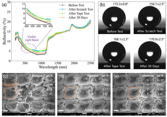 (a) Reflectance spectra of samples at 200–2500 nm after various tests. (b) The contact angle of samples after various tests. (c–e) Surface morphology and elemental content after scratch test, after tape test, and after 30 days.