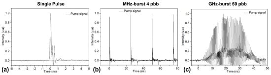 The laser system used for this experiment is a Tangor 100 from Amplitude (Amplitude Laser Group, Pessac, France), which emits pulses at 1030 nm wavelength with a pulse duration of 515 fs. The output beam is linearly polarized. This laser system can operate in repetitive single pulse (SP) mode, in MHz-burst mode with 4 pulses per burst (ppb) at 40 MHz pulse repetition rate and in GHz-burst mode with 50 ppb at an intra-burst repetition rate of 1.28 GHz. The burst repetition rate is adjustable up to 200 kHz and the pulse/burst energy available on the target ranged from 0 to 255 µJ. The measured pulse/burst shapes in these three regimes as in [33] are depicted in Figure 1.