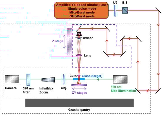 A 2x beam expander is used to set the beam diameter to 10 mm at the entrance of the Bessel beam shaping module. The latter includes a 170° apex-angle axicon to generate the primary Bessel beam and a set of lenses f 1 = 125 mm and f 2 = 10 mm to demagnify this Bessel beam into a secondary Bessel beam with a half-angle of 28.6°. The theoretical non-diffracting zone length was calculated to 1.8 mm [19]. This setup was placed on a motorized Z-axis stage (Alio Industries, AI-LM-10000-I-PLT-LP) for precise positioning of the Bessel beam within the sample. Additionally, the sample was set on XY-monolithic motorized stages (Alio Industries, AI-LM-20000-XY-I-LP) to position it with respect to the Bessel beam and to control the translation for the different series of experiments. Moreover, the station is equipped with a side-view imaging system featuring a green diode emitting at 523 nm and a long-distance microscope (InfiniMax KX with MX5 objective) coupled with a Basler CMOS camera (Basler acA1440-220uc, resolution of 1440 × 1080, pixel size 3.45 μ m × 3.45 μ m, 227 fps, global shutter). Additionally, a 520 nm bandpass filter was used in order to avoid for the camera to be blinded by the processing light. The entire machining station is mounted on a stiff granite base and gantry to ensure experimental stability and repeatability. The translation stages, laser gate, image recording system, and power modulator unit, composed of a half wave plate and a beam splitter, are automated and managed through DMCpro software (Direct Machining Control, Vilnius, Lithuania), giving us complete control and repeatability over the machining station and its parameters. Figure 2 shows a schematic drawing of the experimental setup.