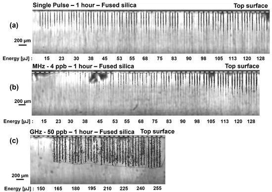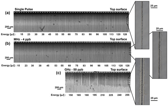 In the upcoming section, the modification depths after laser irradiation in fused silica will be presented as a function of the energy contained in a pulse or burst ranging from 15 µJ to 255 µJ. Each modification was repeated four times on the same sample with a pitch of 50 µm to ensure reliability of the results. We experimentally observed with our side-view system that the modifications resulting from a low-energy Bessel beam start from the middle and then expand to the top and rear surfaces, respectively. For the sake of repeatability, the Bessel beam was initially fully placed inside the medium, generating a modification with 255 µJ. Subsequently, by moving the Z-stage in the direction of the irradiation axis, 30% of the Bessel beam was placed above the top surface of the sample, and only 70% of the maximum interaction length was used to produce the modifications inside the sample. This placement, for all experimental series, guarantees that the modifications reach the top surface for the subsequent etching step, as described in Section 2.3. Moreover, the rising front of the Bessel beam [34] does not interact with the material avoiding intensity variations. Note that the Z-stage was kept in this position and not moved during the experiments. The resulting modifications for the single-pulse, MHz-burst, and GHz-burst regimes are depicted in Figure 3.