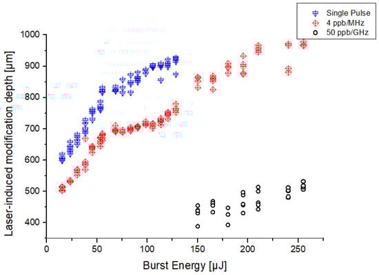 Figure 4. Evolution of the modification depth obtained in fused silica with a single pulse/burst as a function of energy in the range from 15 to 255 µJ, in single-pulse mode, 4 ppb MHz-burst, and 50 ppb GHz-burst. For each energy, at least 4 modifications were measured.