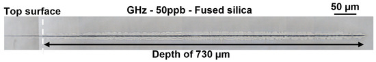 As the GHz-burst interaction with the Bessel beam directly creates an elongated void, we investigate in this sub-section the potential for direct, single-step, and dry hole drilling. As detailed in Section 3.1, all modifications were performed with approximately 70% of the Bessel beam inside the sample to ensure a relatively even energy distribution within the sample for the study of etching with respect to pulse energy. More experiments were conducted by placing the entire Bessel beam inside the sample to achieve the longest interaction length within the sample. In this way, we produced longer modifications clearly exceeding the 525 µm length presented in Figure 4. As displayed in Figure 7, we achieved in single shot in pristine fused silica a hole of 730 µm in length with an entrance hole of 4 µm, resulting in an aspect ratio of 182:1. However, it must be noted that this hole presents cracks around the periphery of the affected zone along the hole due to material removal or voids generated by the single GHz-burst. This behavior intrinsically limits the minimum spacing between consecutive holes that can be produced without important damage to the bulk material; hence, this process could be used to generate matrices in bulk material with thicknesses below 700 µm and very tight conduct < 5 µm, with relatively large spacing > 50 µm, depending on the application. Advantageously, the hole generation requires only one step since the hole is generated with a single GHz-burst and without any post-processing etching step. This capability for direct, single GHz-burst drilling in Bessel beam shape paves the way for on-the-fly glass drilling of through-holes as required in TGV.