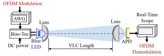 Figure 1 presents the experimental setup of VLC transmission system by utilizing the blue LED and 400 MHz bandwidth silicon (Si) avalanche photodiode (APD, Thorlabs) as optical Tx and Rx, respectively. To carry the OFDM-QAM modulation signal on the blue LED [24], a proper bias-tee (BT) with 3 GHz operation bandwidth is applied to connect to the DC current and AC signal for lighting and signaling. In the measurement, the bias current of blue LED is set at 70 mA. As shown in Figure 1, a focusing lens with diameter of 50 mm on the Tx side can result in a narrow divergence diameter on the Rx site for increase the detected optical signal to noise ratio (SNR) of VLC traffic. Besides, to focus and enhance the detected LED VLC illumination through the 400 MHz APD, a focusing lens also with diameter of 50 mm is placed in front of the APD, respectively, so that the light power emitted by the LED can be collected more concentratedly. In the measurement, an arbitrary waveform generator (AWG) with analog bandwidth of 20 GHz and sample rate of 50 GS/s (Tektronix) is employed to cause and generate the OFDM-QAM modulation signal through the Matlab programming. The produced OFDM-QAM also has bit- and power-loading design to operate on the blue LED for delivering VLC. To obtain the best output signal-to-noise ratio (SNR) and bit load output, the adaptive bit- and power-loading algorithm is applied for coding and decoding. Here, the cyclic prefix (CP), data length, training length, fast Fourier transform (FFT) size and OFDM subcarrier number used are 32, 500, 50, 512 and 90 in the experiment, respectively. Through a length of wireless VLC transmission, the OFDM VLC signal is received by an APD directly to transfer to electrical signal and decoded by using a real-time scope with analog bandwidth of 16 GHz and sample rate of 80 GS/s (Teledyne Lecroy WaveMaster). Therefore, the received electrical OFDM signal is also captured by applying offline Matlab programs for the decoding signal. To simplify and reduce the complexity of the proposed VLC transmission system, we do not use any equalization and filtering technologies on the optical Tx and Rx modules to demodulate the signals.