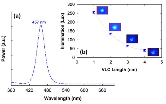 First, Figure 2a displays the measured output spectrum of blue LED. The center wavelength of the LED is around 457 nm. To realize the obtainable illumination of the LED indoors, a power meter (PM) is employed for measurement after an optical wireless transmission length of 1 to 4 m without going through the lens of the Rx site, respectively. Figure 2b shows the observed illumination of blue LED through various wireless VLC link lengths, and the detected illumination of the blue LED is 255, 133, 64 and 40 lux through the VLC link of 1, 2, 3 and 4 m, respectively. Furthermore, the insets of Figure 2b are the corresponding photos of light spots under various free space link lengths. Due to the use of lenses with a smaller divergence angle, the observed spot diameter would be less than 8 cm after a 4 m VLC link length, as seen in the insets of Figure 2b. In addition, the corresponding spot diameters of 5.5, 6, 6.5 and 8 cm are observed after through a free space link length of 1, 2, 3 and 4 m, respectively. As we know, the valuable illumination would influence the optical signal-to-noise ratio (SNR) of the detected OFDM signal. The obtained results of Figure 2b will help to understand the verification of the next VLC transmission experiment.